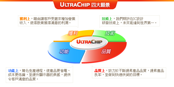 晶宏半导体UltraChip 在草创命名之初,就设定要在IC晶片设计的独特领域上做到宏大极致,并以世界第一流的晶片设计公司自诩。对于未来的展望,是透过我们的经营、研发、营运、销售团队的统合与先进的标准化,设定了晶宏未来的愿景与任务。